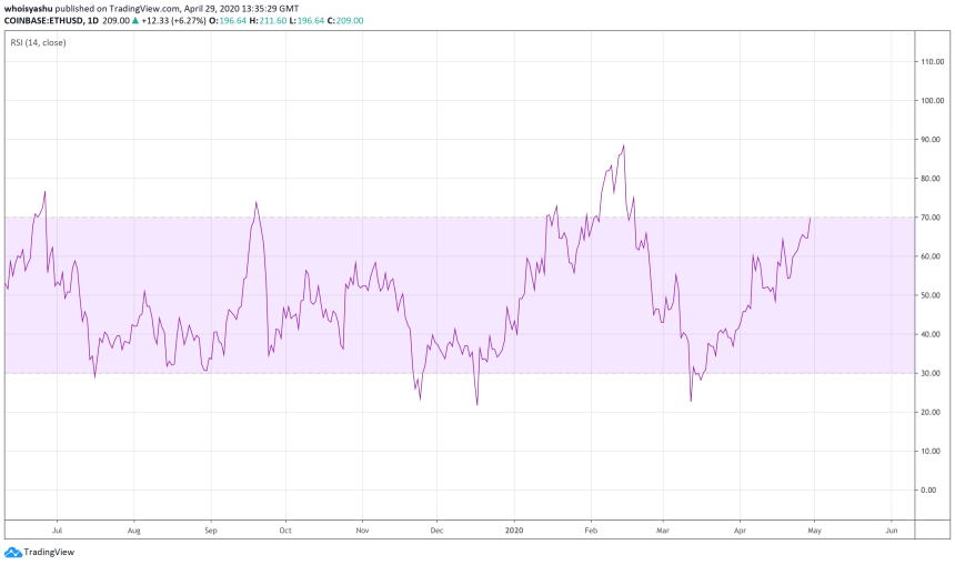 Ethereum’s recent upside pullbacks have tested $226 as their resistance targets. Back in 2019, the cryptocurrency tested the level twice in a 30-day timeframe, only to see its price falling back by an average of 25 percent. In the first quarter of 2020, the price broke above it, but that also pushed its momentum indicator (RSI) into an overbought region.
