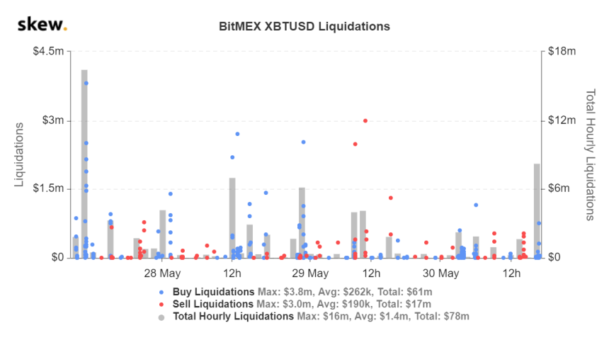 Crypto derivatives tracker Skew.com noted that over the past four hours, upwards of $10 million worth of short positions on BitMEX have been liquidated. This adds to the dozens of millions liquidated over the past few days as BTC has rocketed higher from $8,600 to the current price.