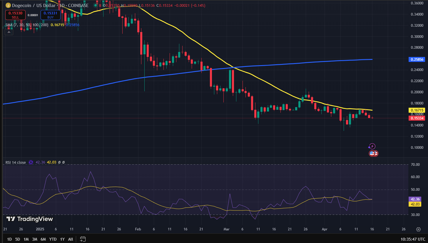 Intanto Dogecoin sta continuando a scambiare sotto la sua media mobile a 30 giorni (in giallo), un segnale che le prospettive a breve termine sono ribassiste.