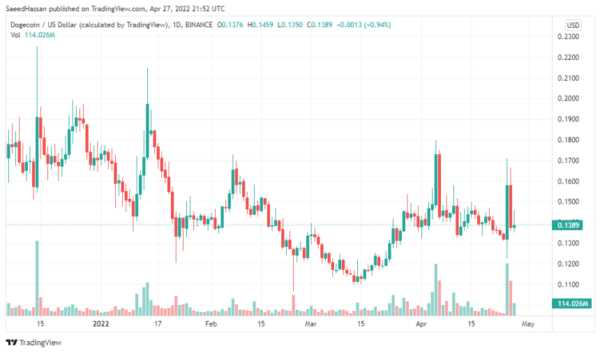 Investors are raising concerns about Elon Musk’s acquisition of Twitter. After soaring to a multi-week high price, the Dogecoin has crashed by 20% and is trading at $0.1381 with a total market cap of around $18 billion.