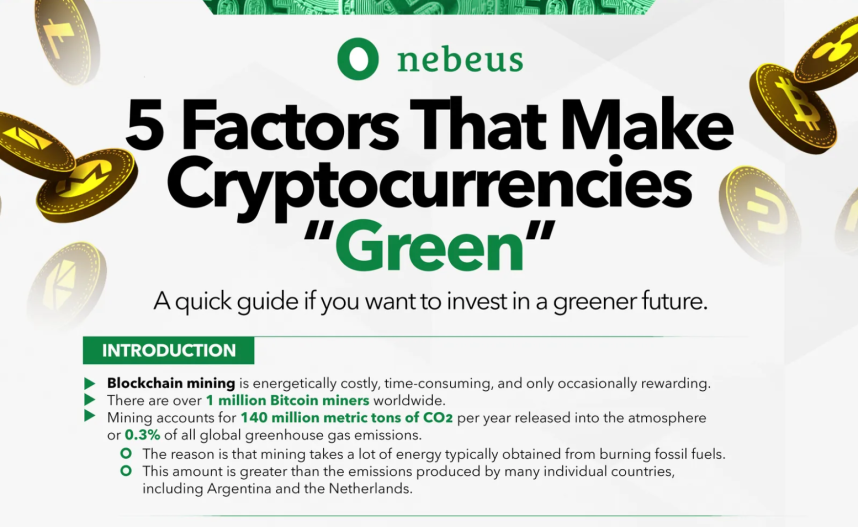 Green currencies are easier to find than you would think. According to the experts at Nebeus, these are the most eco-friendly cryptocurrencies on the market: Cardano is the seventh-largest cryptocurrency by market cap and uses a PoS system to reduce its use of natural resources. Nano is unique because it creates virtually no carbon footprint or energy consumption. Each address on Nano has its blockchain, so each user has the power to verify their transactions. Solarcoin is connected to solar energy and was created to incentivize a solar-powered planet. A new token of Solarcoin is created for each solar-powered megawatt generated.