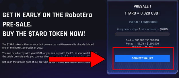 Next, visit RobotEra and click the connect wallet button. You should see a notification from MetaMask – confirm it. Don’t forget to double-check that you’ve got the ETH or USDT funds that you need to make the TARO purchase.