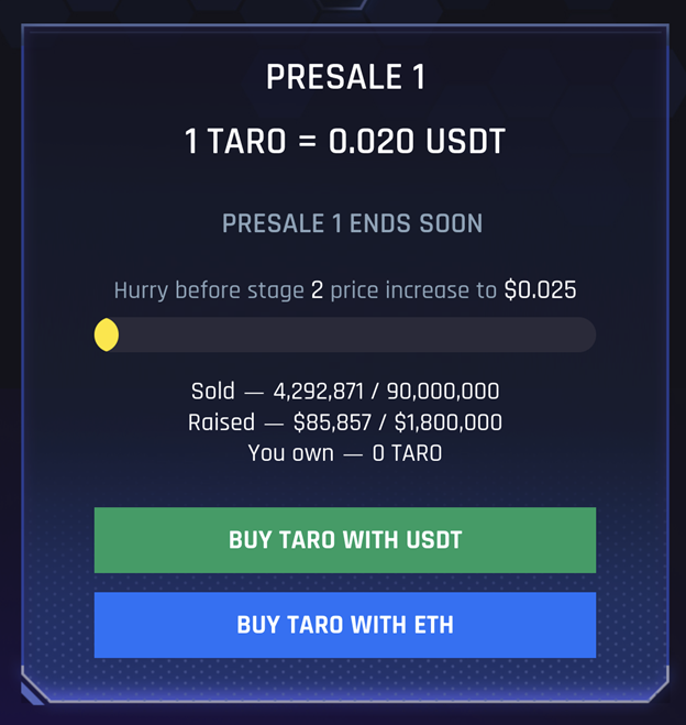 Buying the TARO token is a simple and straightforward process. The TARO presale is currently in its first presale, so it’s at the lowest price which is really beneficial to early investors.