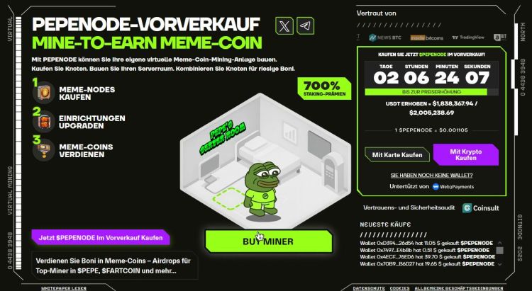 Ein Web3-Game mit Mine-to-Earn-Algorithmus und Gamified Virtual Mining – Pepenode.io setzt auf einen aktiven Presale und möchte sich alleine dadurch bereits von der Konkurrenz abheben. Gerade die ersten Nutzer bekommen hier den Vorteil, dass frühzeitige Nodes eine höhere Effizienz vorweisen; gepaart mit der hohen Staking-Rendite könnte sich ein Blick auf das Projekt lohnen.