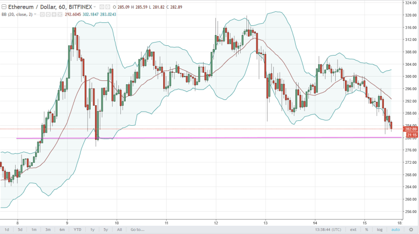 Ethereum fell a bit during the day on Tuesday, as we are now testing the $280 level. I believe this is an area that should offer a significant amount of support, so we break down below there that could be very negative sign, perhaps sending this market down to the $265 level. Alternately, if we can get a bounce from here I think the market will go looking towards the $300 level again.