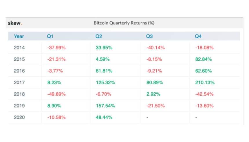 Analytics platform Skew recently offered a chart showing the cryptocurrency’s historical quarterly performance.