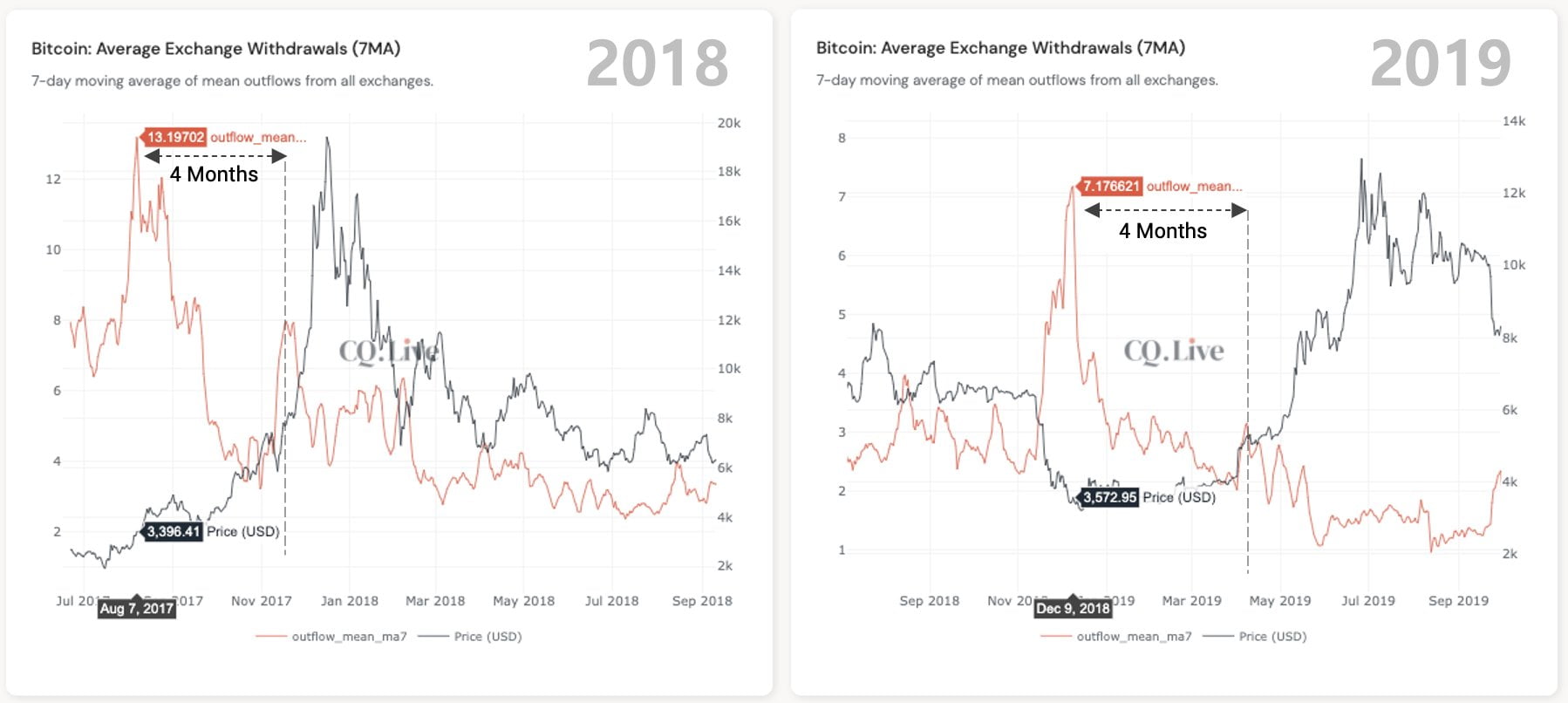 Mr. Ju cited fractals from 2017 and 2019, stating that four months after whales debited their cryptocurrency holdings out of exchanges, the bitcoin price spiked handsomely. So it seems, the BTC/USD rose from below $6,000 to $20,000 in 2017 and from under $4,000 to $14,000 in 2019.