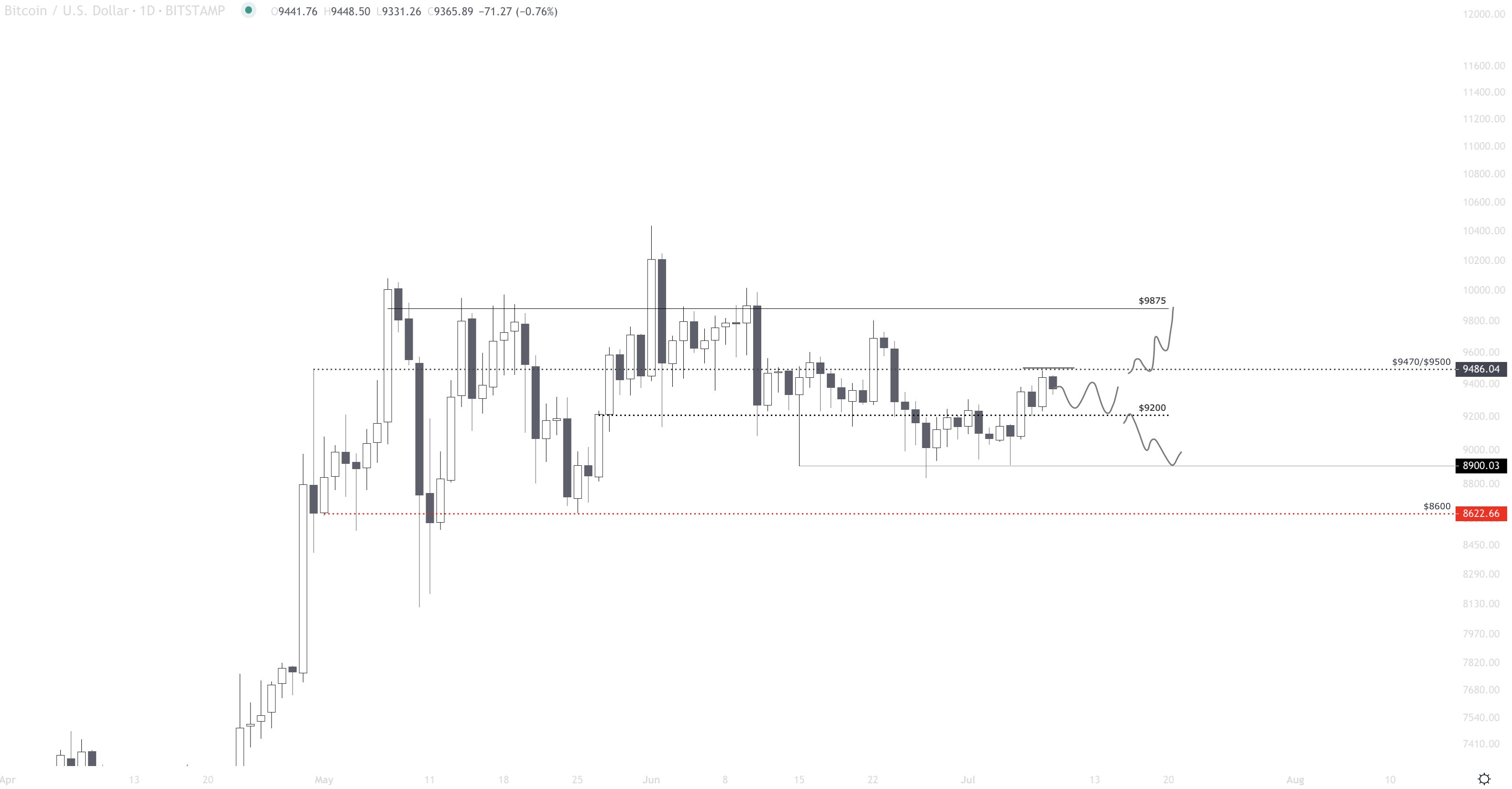 “BTC HTF Update: Perfect tap against $9500 and pulling back now which is fine as long as bulls can defend $9200 as support on the next retest, I would be very short if $9200 fails to hold. Looking for S/R setups for both biases right now and staying out of this chop action.”