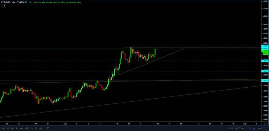 Tezos has seen some strong price action in recent weeks, with the cryptocurrency pushing as high as $4.40 earlier today before hitting some heavy resistance that slowed its ascent.