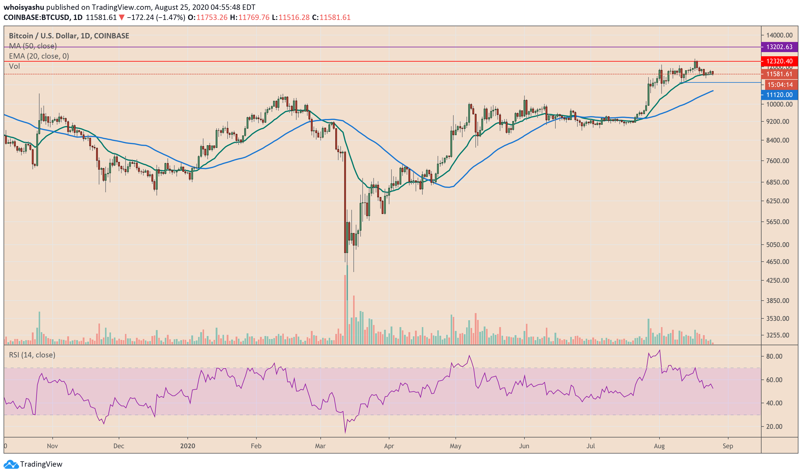 Bitcoin is trading marginally below its short-term support at the 20-daily exponential moving average (the green wave in the chart below). An extended daily close below it points to a correction towards $11,370.
