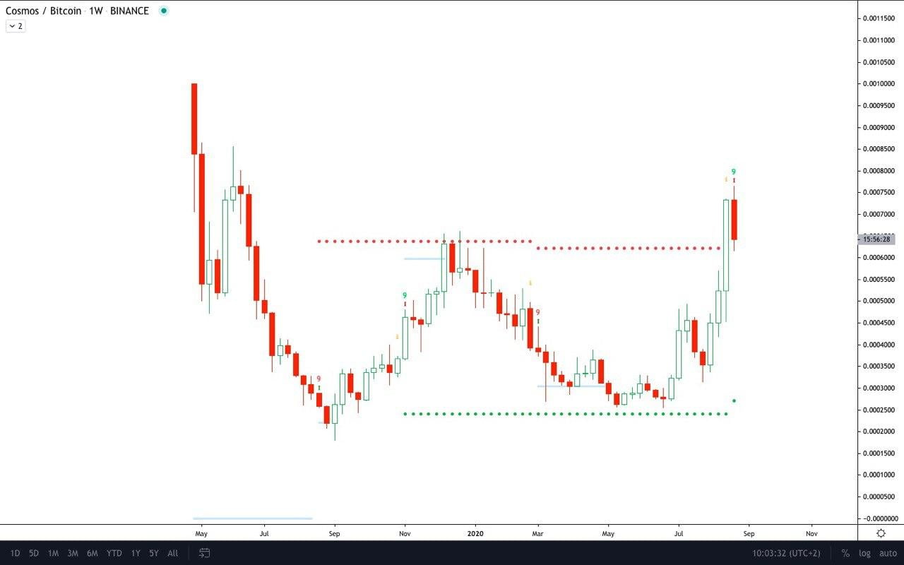 Chart of Cosmos' price action against BTC over the past year or so from a Telegram channel tracking the Tom Demark Sequential. Chart from TradingView.com