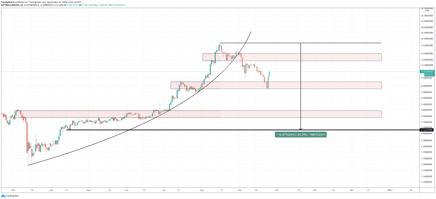 Just because Chainlink’s recovery is impressive, it doesn’t necessarily mean that the asset is will be off to new all-time highs once again. The altcoin’s parabolic advance has been broken, and when that occurs, statistics show that assets regularly fall 80% or more afterward.