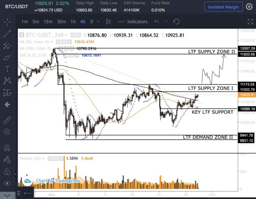 “BTC approaching key bias levels of mid-range of the whole 9800-12000 range. We could expect short-term throwback after intraday distribution inside LTF supply zone. Once MA200 support is reclaimed, we should see 12k,” he said while pointing to the below chart.
