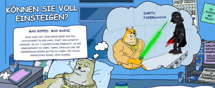 Maxi Doge repräsentiert jene Krypto-Trader, die sich mit vollem Einsatz ins Trader-Leben stürzen. Hier geht es nicht darum, ein paar Prozente abzugreifen, sondern um den ganz großen Erfolg. Demzufolge lautet das Motto ganz klar: „In Gains We Trust“.
