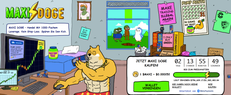 Investoren können den Token jetzt im Presale zum Preis von nur 0,000252 $ kaufen. Doch aufgrund des großen Andrangs steht die nächste Preiserhöhung schon bevor. Wer schnell ist, kann sich einen stärkeren Hebel sichern, wenn Maxi Doge an die Kryptobörsen geht und zum Erfolg wird. Die Zahlung ist mit Krypto und Karte möglich.