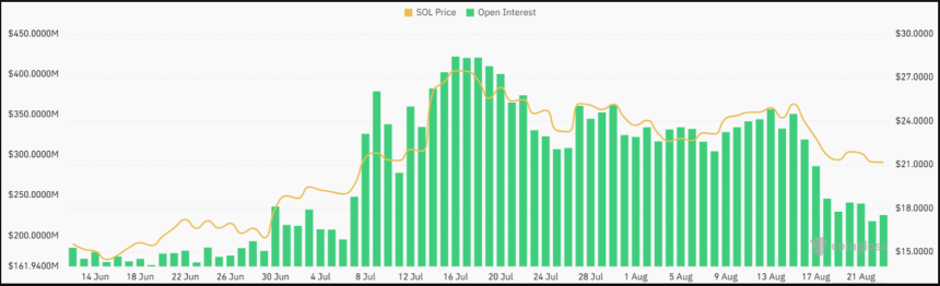 Analyzing the market structure on the 1-day chart reveals a bearish picture for SOL. The cryptocurrency recently established a lower high at $25.68 coupled with a lower low at $22.23 on August 5.