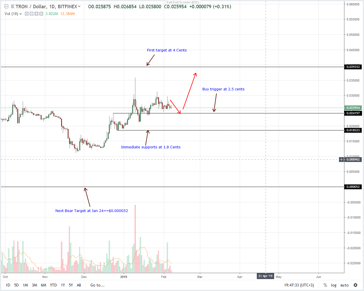 For aggressive traders, every low is technically a buying opportunity. That is only applicable as long as TRX prices are trending above 2.5 cents. Note that TRX/USD is trading within a bullish breakout pattern with clear supports at 2.5 cents.