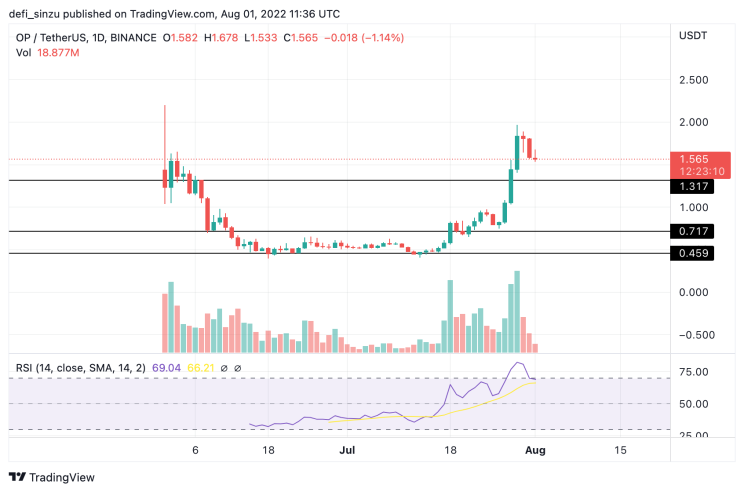 As of writing, OP is trading at $1.567 and could go to $1.34, which is the nearest support for accumulation.