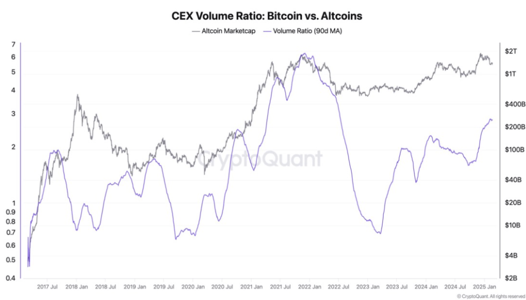 According to CryptoQuant’s data, the long-awaited altcoin season may have officially arrived. The CEO of the crypto market company, Ki Young Ju, has pointed out a significant surge in altcoin volume on Centralised Exchanges (CEXs).
