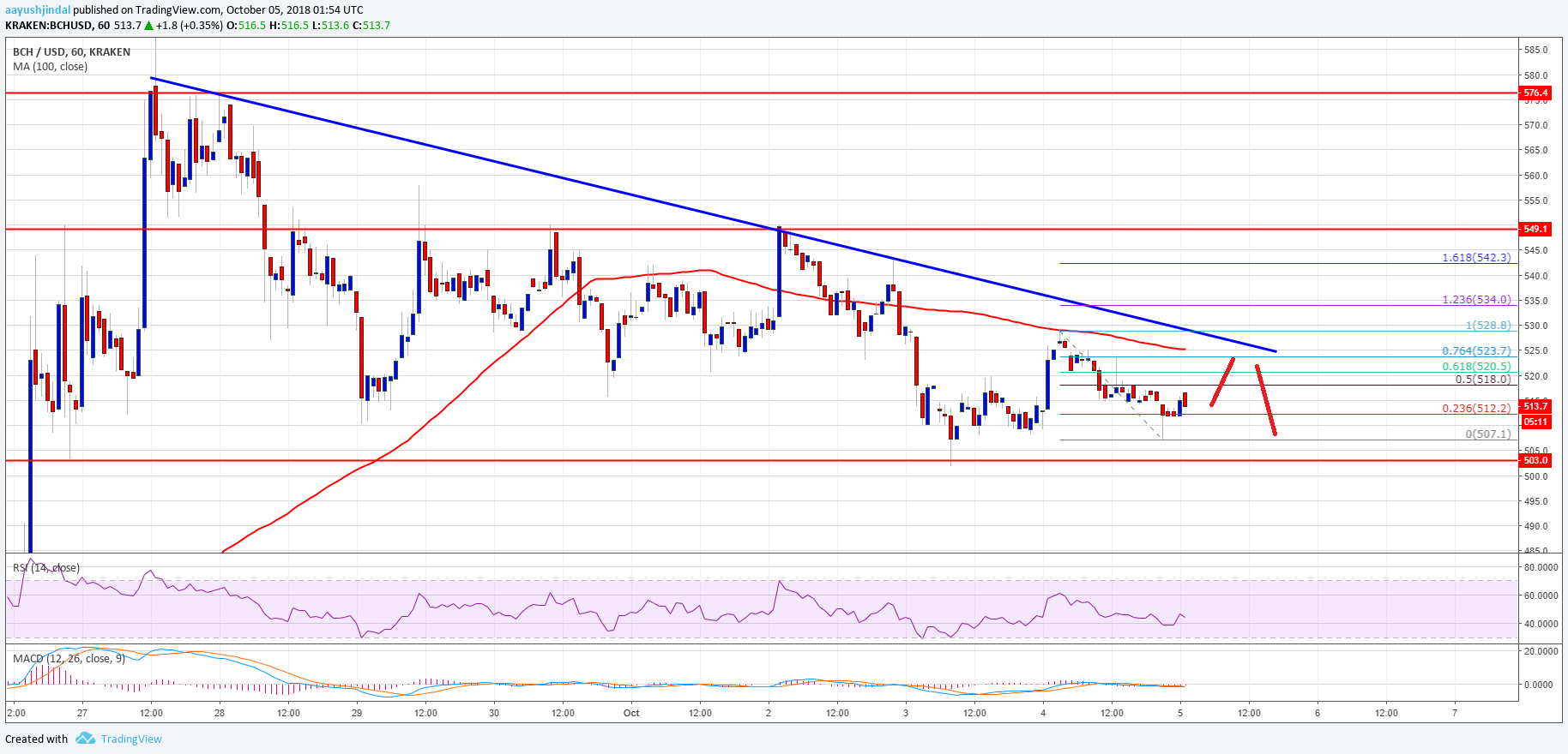 The recent swing low was formed at $507 and the price is currently correcting higher. An immediate resistance is near the 61.8% Fib retracement level of the recent drop from the $5528 high to $507 low at $520. Above this, the price is likely to face a strong resistance near the $530 zone. More importantly, this followed important bearish trend line is intact with resistance at $525 on the hourly chart of the BCH/USD pair. Therefore, buyers need to clear the $525 and $530 resistance levels to push the price in a positive zone.
