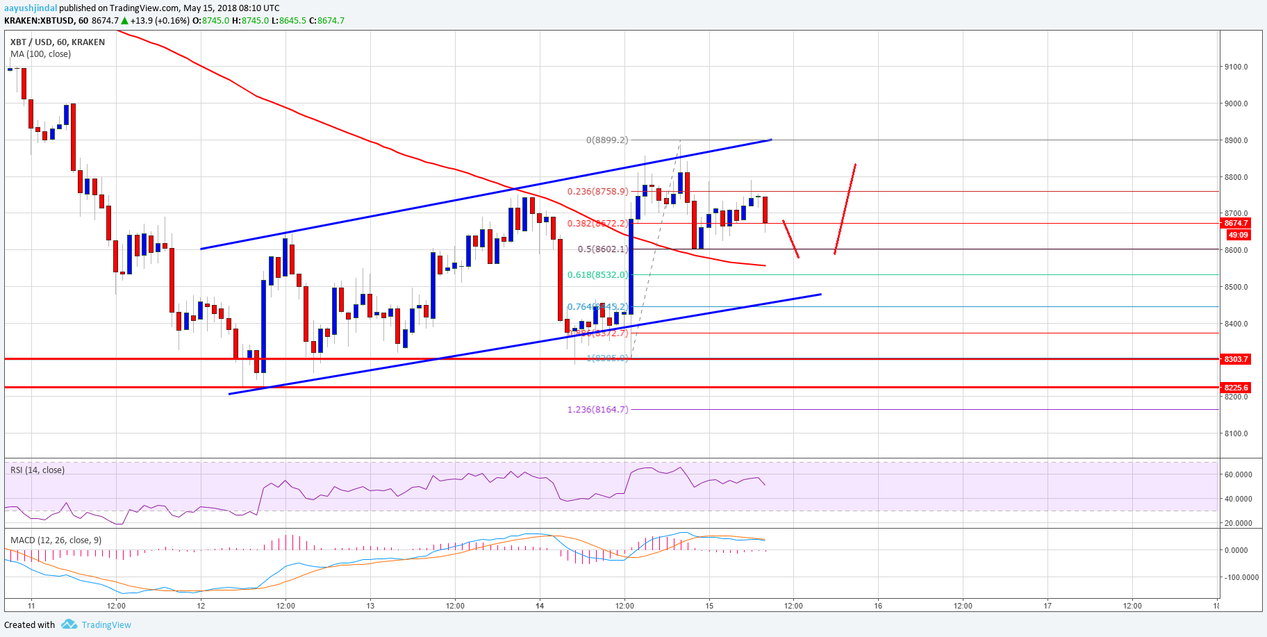 There was a slow and steady rise in bitcoin price above the $8,500 resistance against the US Dollar. The price traded higher and even broke the $8,600 resistance level to settle above the 100 hourly simple moving average. The upside move was positive, as the price traded close to the $8,900 resistance level. A high was formed at $8,899 before the price started a downside correction.