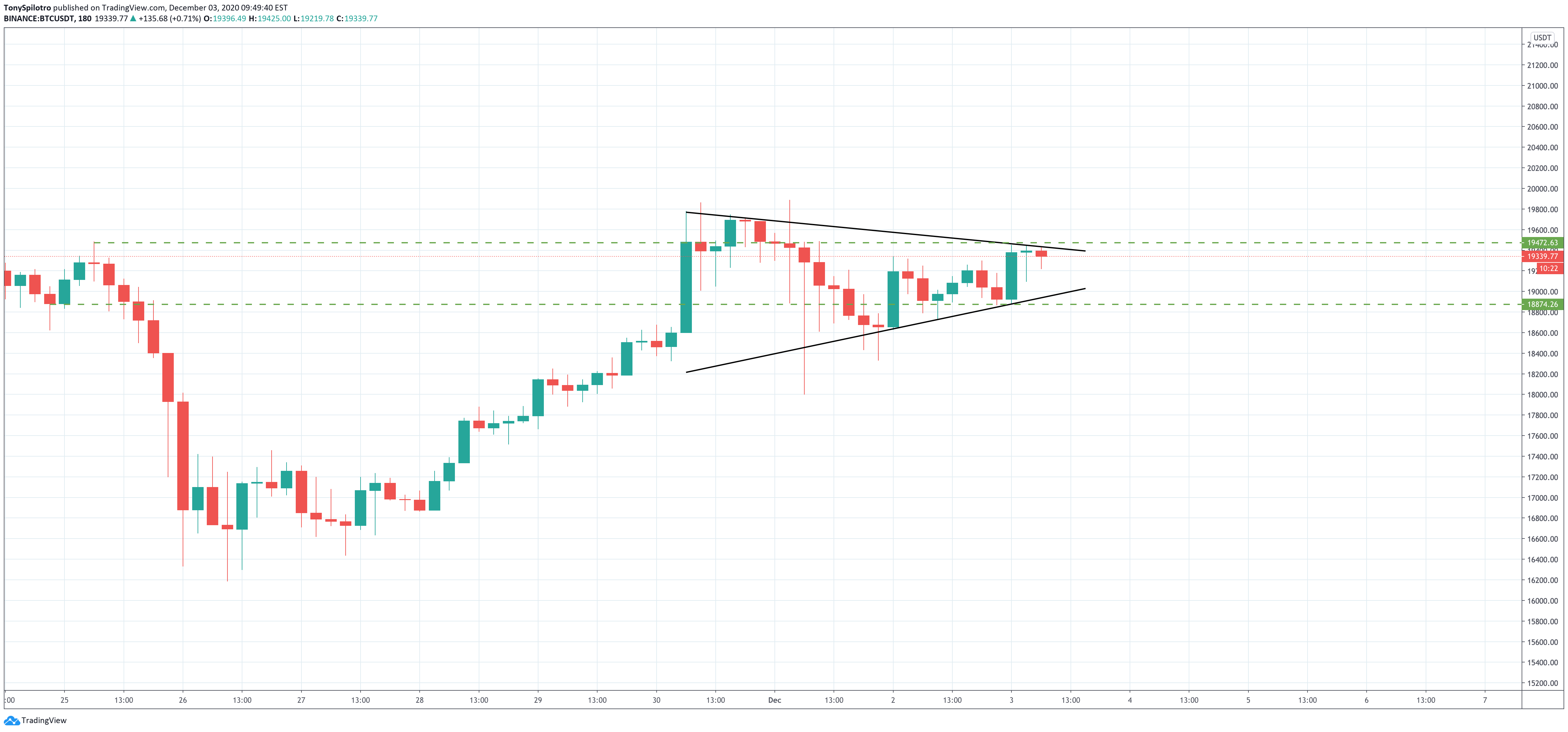But after that powerful surge, indecision is showing through a reduction in volatility, and a tightening trading range. Bulls and bears are both in a standoff at this point, and either a drop is near, or $19,500 will finally give in as resistance. Here’s a look at how close the crypto asset is coming to a break in one direction or the other.