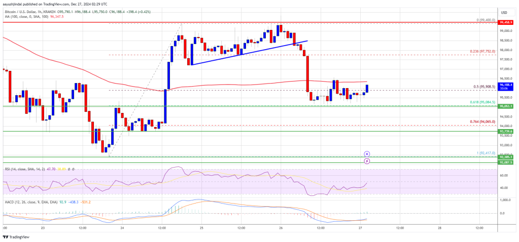 The pair cleared the $99,000 resistance level and traded close to the $100,000 resistance level. A high was formed at $99,400 and the price recently started a fresh decline. There was a move below the $96,500 support. The price dipped below the 50% Fib retracement level of the upward wave from the $92,415 swing low to the $99,400 high.