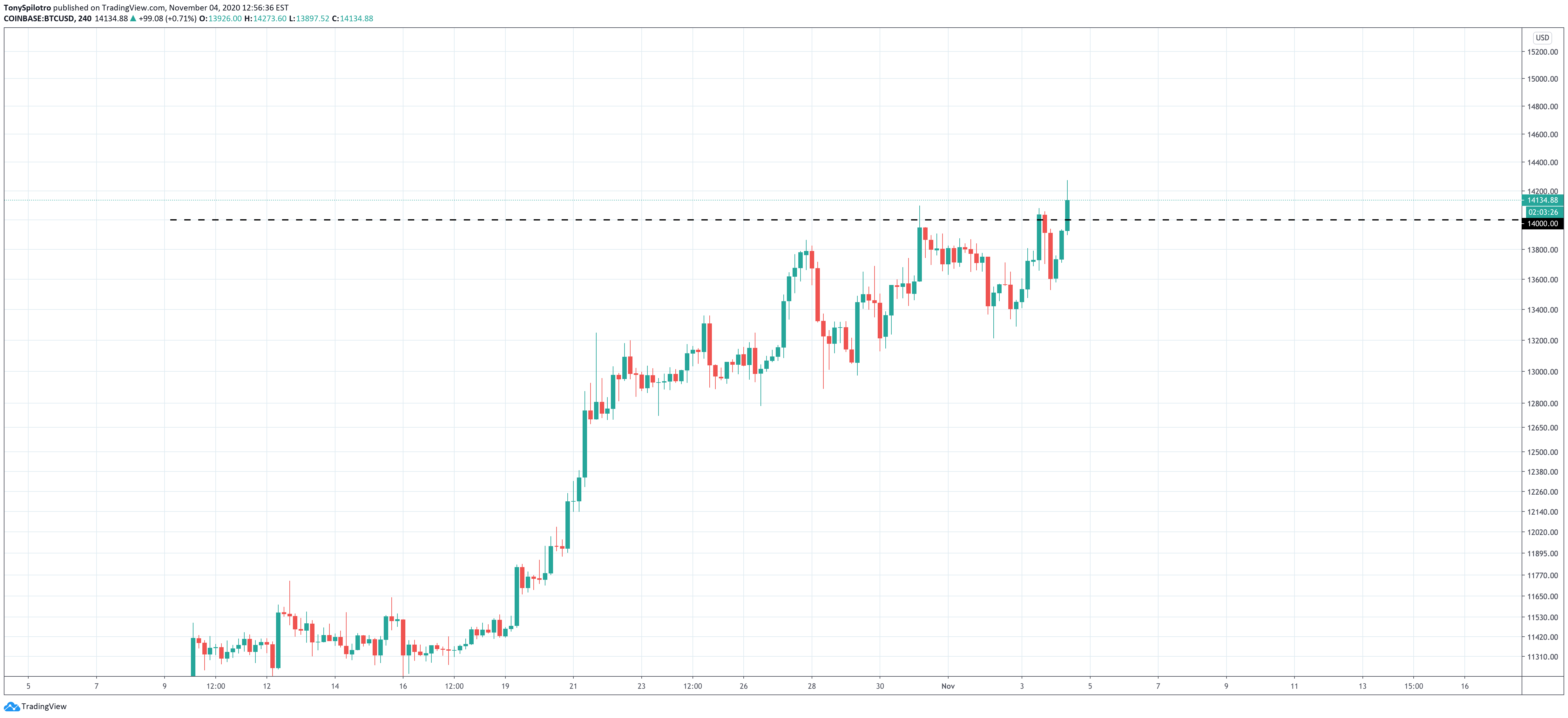 Bitcoin clears $14,000 as the world waits for a President to be chosen | Source: BTCUSD on TradingView.com