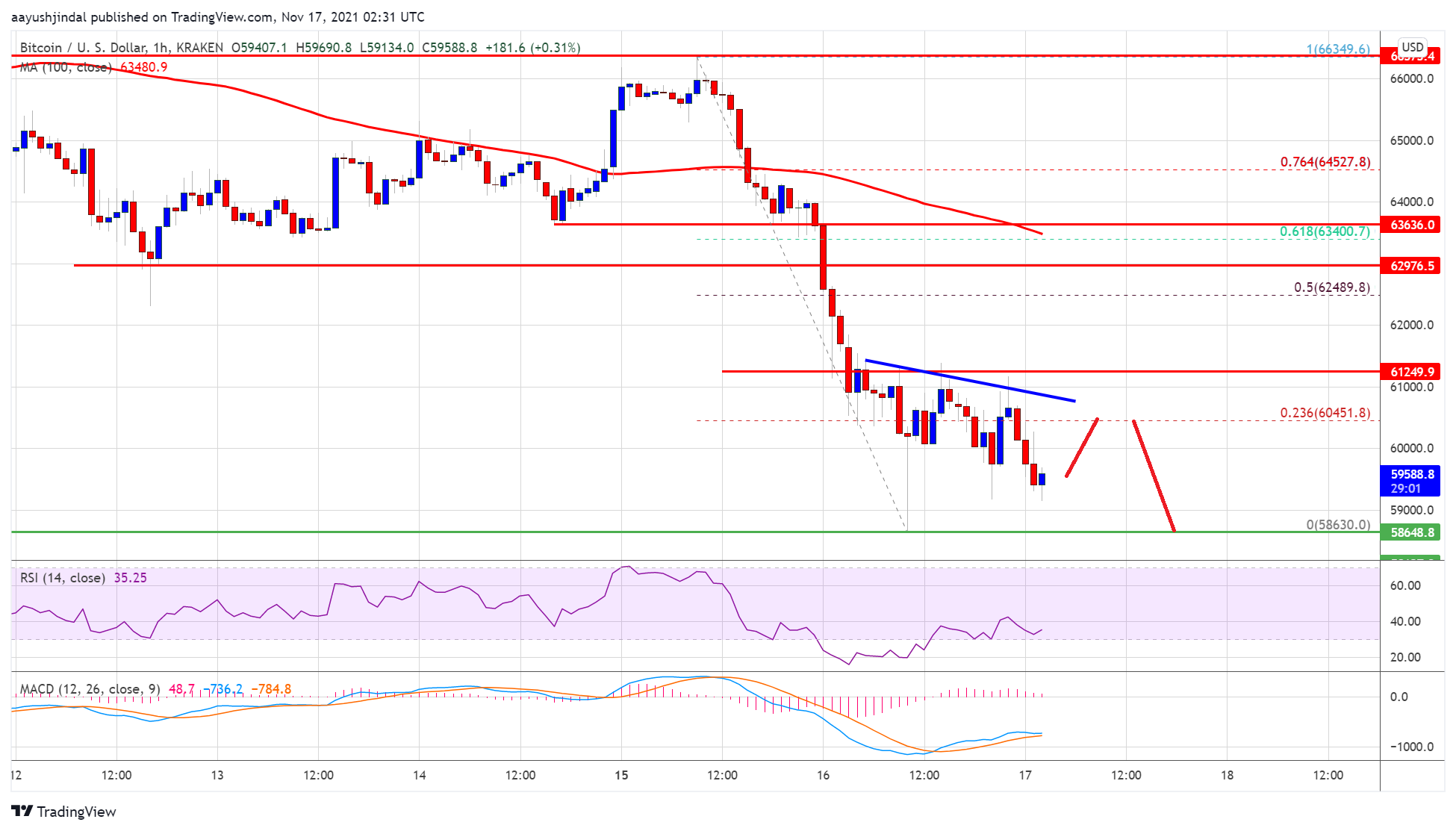 There was a clear break below the $62,000 support and the 100 hourly simple moving average. Finally, the price traded below the main $60,000 support zone. A low is formed near $58,630 and the price is now consolidating losses.