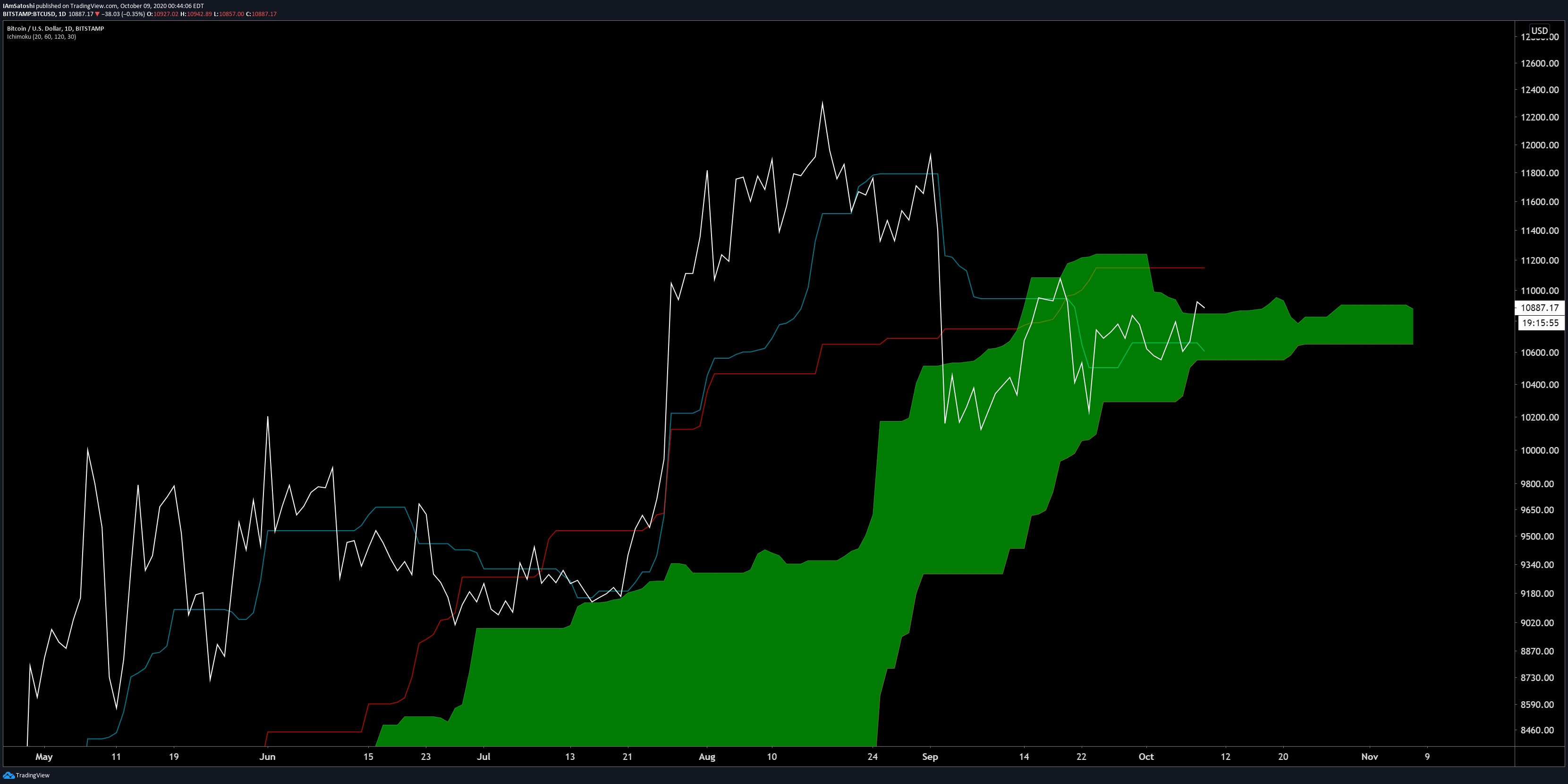 The Ichimoku Cloud is a momentum indicator often used in technical analysis to gauge an asset’s trend. It is currently indicating that Bitcoin (BTC) is healthily recovering from an important support area.