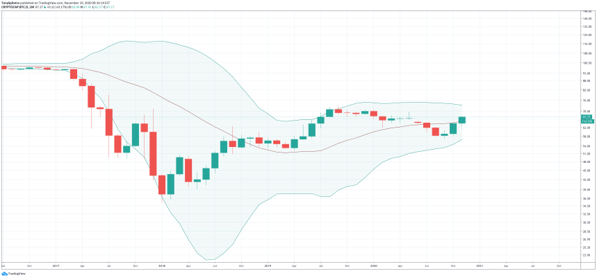 In the chart below, the monthly BTC.D chart is also closing above the middle-line on the Bollinger Bands. The metric climbed another 30% the last time it closed above the moving average and usually guarantees at least a touch of the upper Bollinger Band which currently resides at 2019 highs.