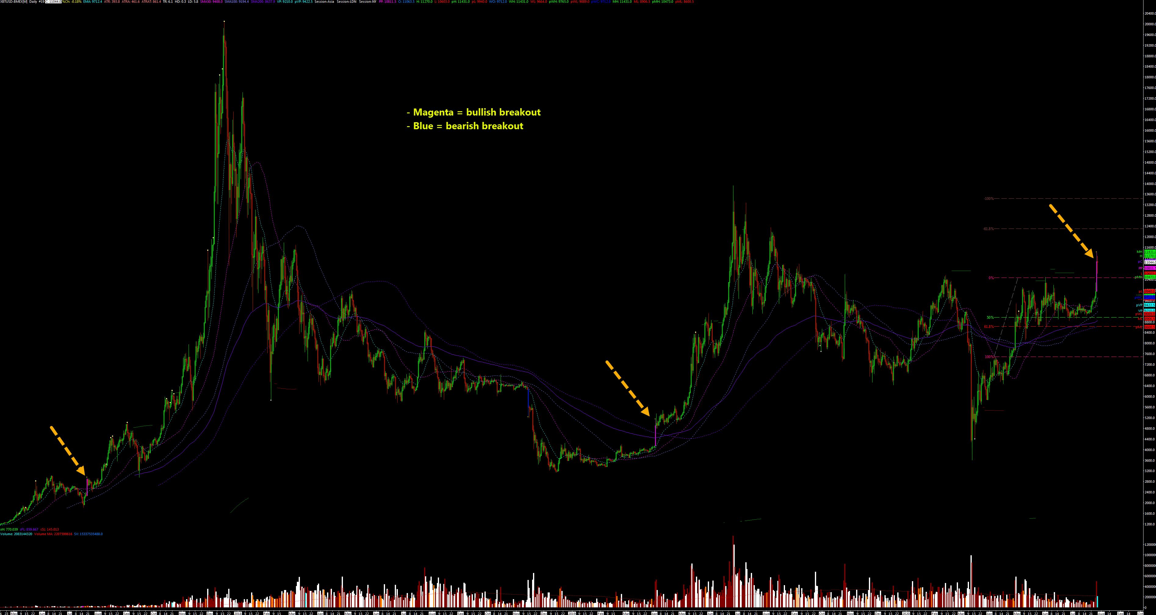 “Major BTC bullish breakout signal on the daily,” he said while pointing to the below chart.