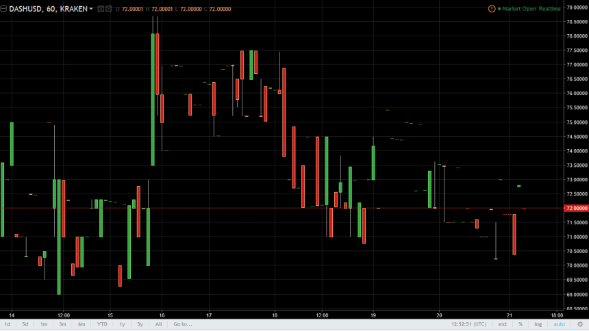 DASH continues to chop around in a very tight range against the US dollar, as $70 offers a very significant support. As we find ourselves getting closer to that level, I’m more apt to start buying and perhaps try to hang on to the move until we get to at least the $70 level. This is a very illiquid market, so the moves are choppy. Because of this, by nature you have to pay attention to the longer-term trends if possible, and be as patient as possible.