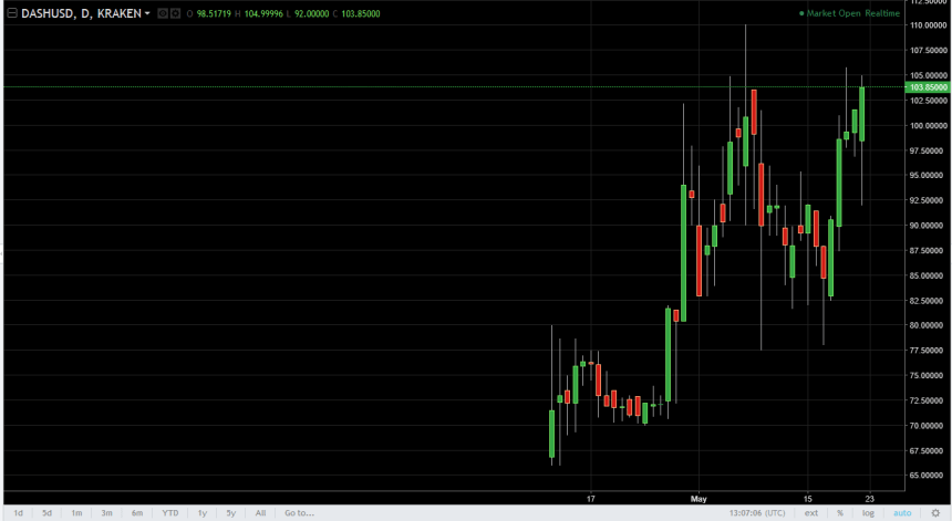 DASH initially fell during the day on Monday but found enough support at the $92.50 level to turn around and bounce significantly. In fact, we tested the $105 level, and the area of contention as of late. If we can break above there, the market should then go to the $110 level next. Ultimately, I believe that the markets will continue to find buyers on dips, and we will eventually break above the $110 level, so I am bullish longer term.