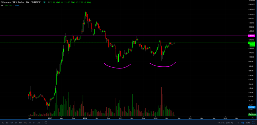“Ultimately, this ETH break higher would continue to paint the picture of a multi-year double bottom, with a neckline at $365. If the double bottom completes over $365, use your imagination for how high we go.”