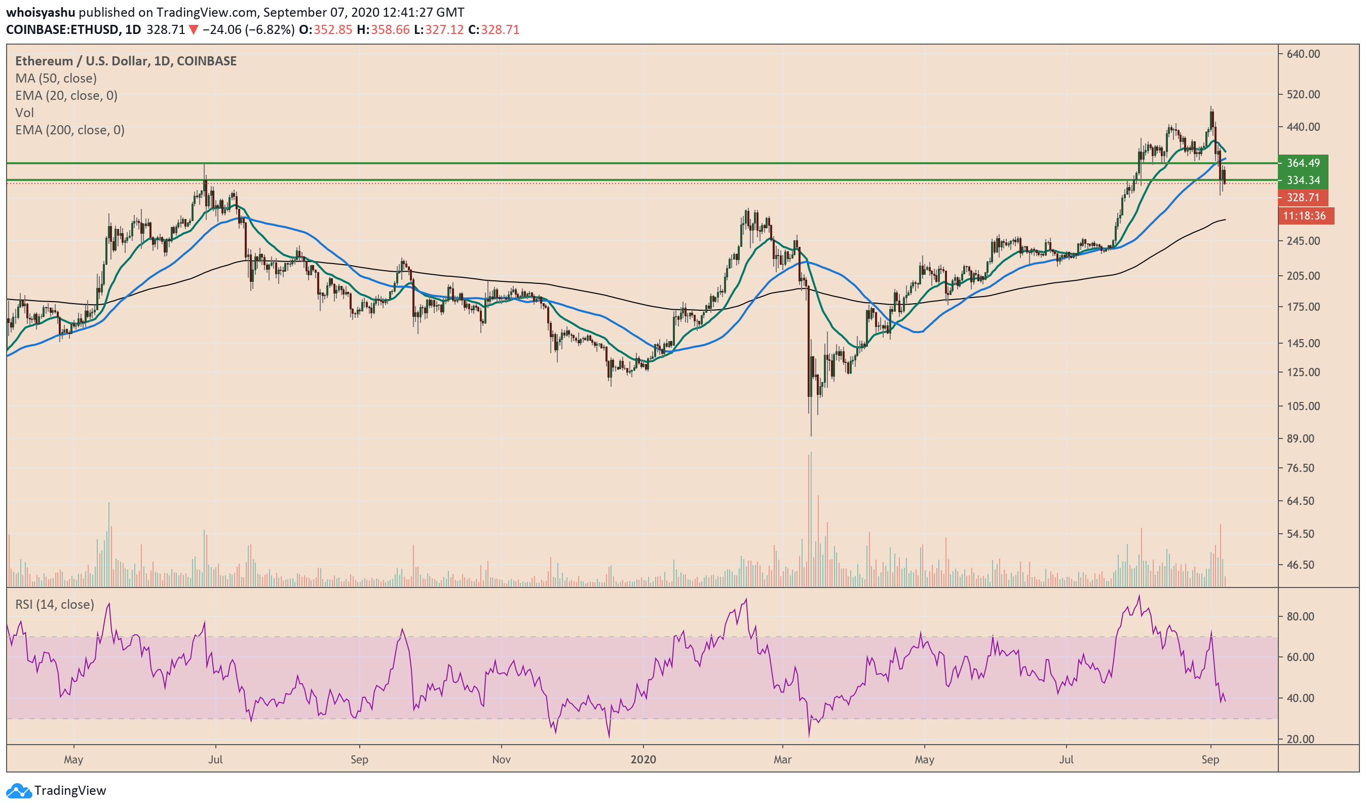 The ETH/USD exchange rate was down 6.82 percent ahead of the New York opening bell, trading at circa $328.