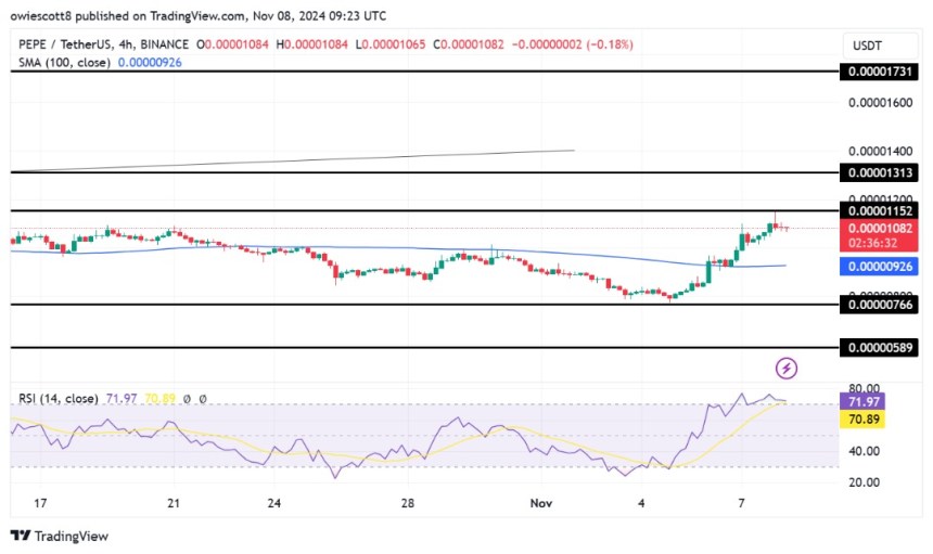 PEPE has recently taken a bearish shift on the 4-hour chart, encountering strong resistance at $0.00001152. This struggle to sustain the uptrend has triggered a decline, pushing the asset toward the 100-day Simple Moving Average (SMA). A drop below this SMA could amplify selling pressure, while a rebound might signal a potential price reversal.