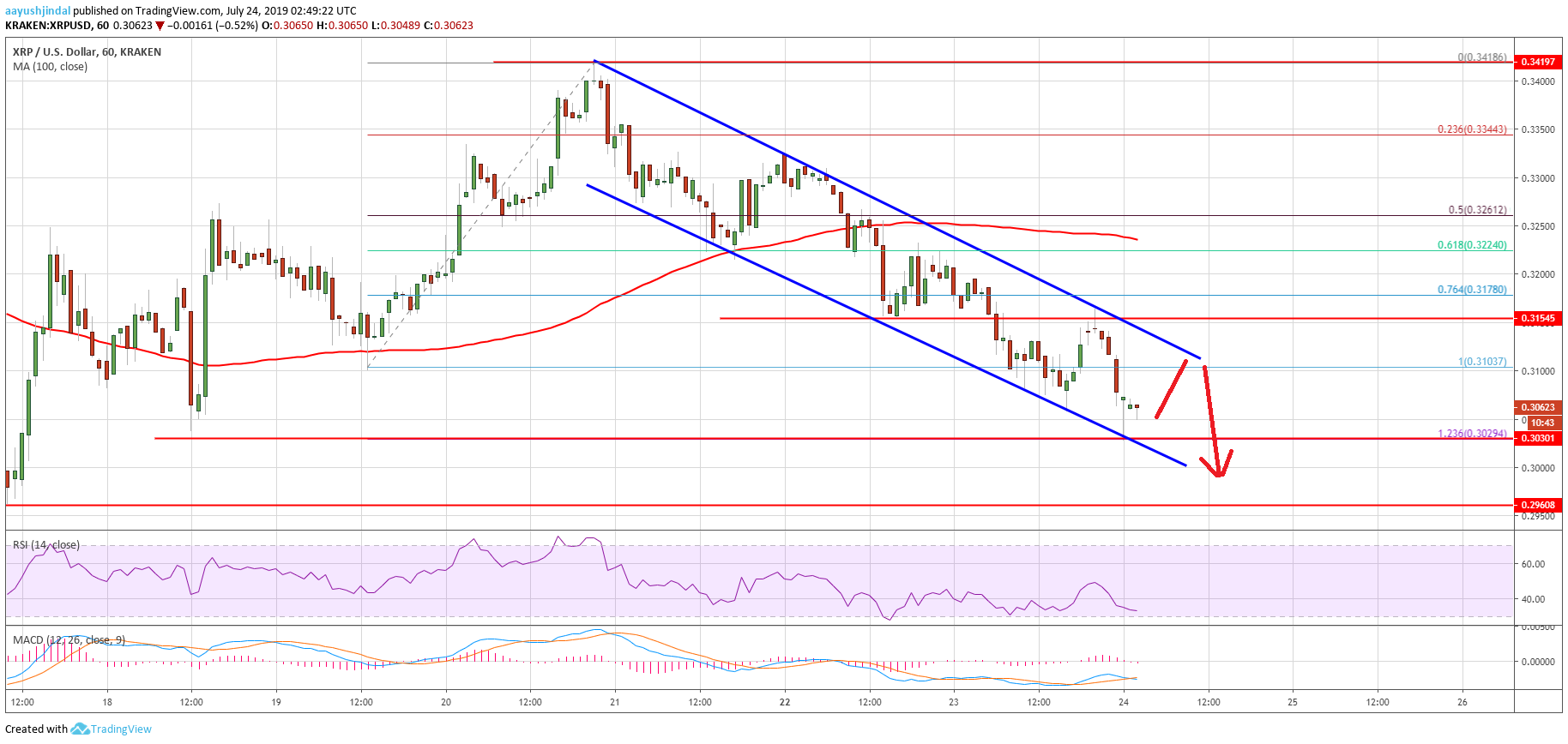 In the past two days, there were steady losses in bitcoin, Ethereum and ripple against the US Dollar. The XRP/USD pair failed to stay above the $0.3250 and $0.3200 support levels. Moreover, there was a break below the $0.3100 support level. The decline was such that the price even traded below the 76.4% Fib retracement level of the upward move from the $0.3103 low to $0.3420 swing high.