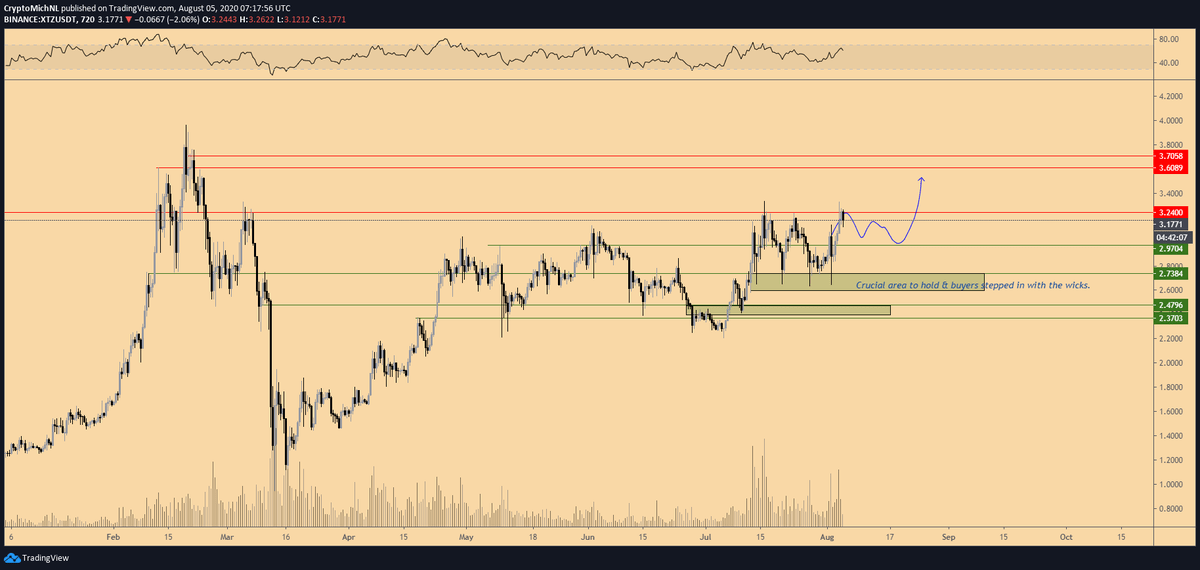 “Tezos: All fine. If we go towards 3$ and hold there (Which is a level on lower timeframes), I’ll be happy to buy the dip. Overall, seems ready for a test of the highs at $4.”