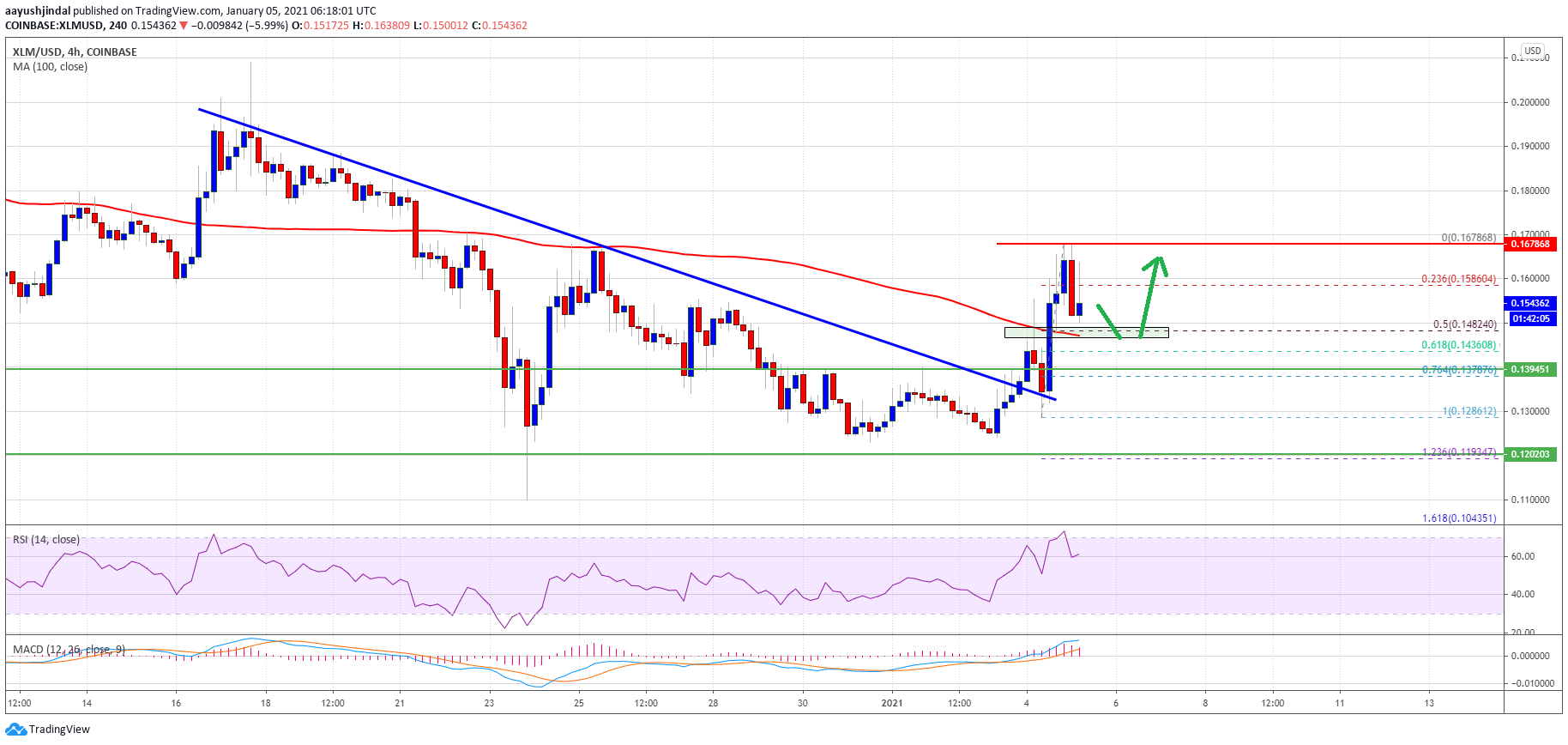 There was a clear break above the $0.1350 and $0.1380 resistance levels. There was also a break above a crucial bearish trend line with resistance near $0.1367 on the 4-hours chart of the XLM/USD pair. The price rallied above the $0.1500 level and settled above the 100 simple moving average (4-hours).