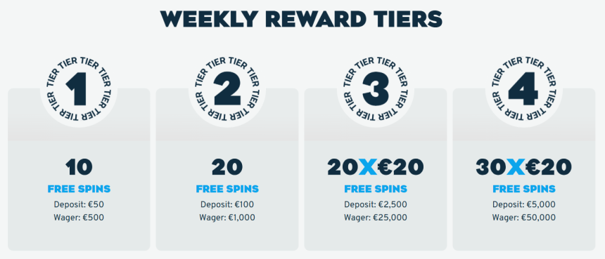 對於現有玩家來說,Cryptorino是獲得每週免費旋轉的絕佳選擇。根據你從週一到週四的投注活動,你可以解鎖價值每次令人垂涎的20歐元的30次免費旋轉!不過,請注意需要大量投注才能釋放這些超大旋轉。