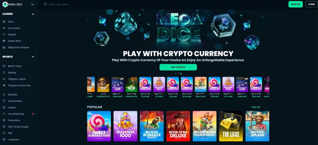 支付層面支援Bitcoin、Ethereum、Dogecoin、Cardano、BUSD、Bonk與Pepe Coin等多種資產,交易速度快且透明,最低入金約20美元。憑藉海量內容、高額紅利與加密友好支付設計,Mega Dice已成為2025年最具代表性的加密娛樂品牌之一。
