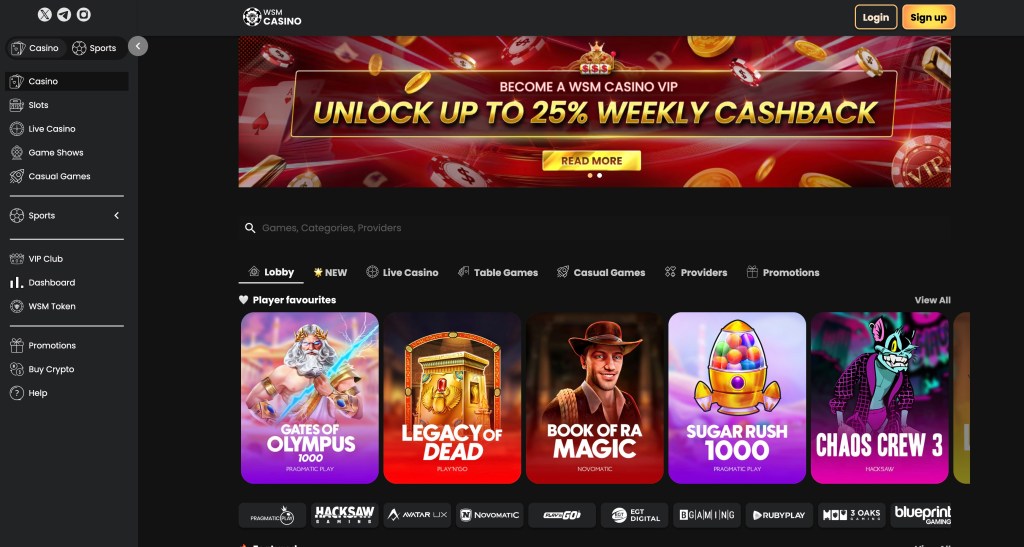 WSM Casino於2022年成立並獲庫拉索及Anjouan雙重監管,是結合娛樂與體育投注的加密綜合平台。支援22種主流加密貨幣,交易即時免手續費,最低入金0.0001BTC、每日提款上限達5,000美元,提供高效率且私密的資金操作環境。