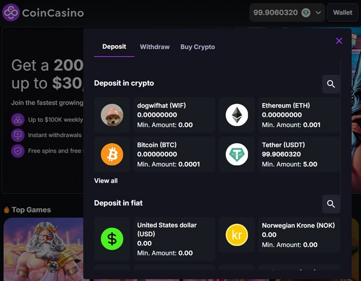 في CoinCasino اون لاين تُضاف المكافأة تلقائيًا على أول إيداع لذا ليس هناك إجراء إضافي. الآن انتقل إلى صفحة المحفظة أو الإيداع . ستجد قائمة بطرق الدفع – اختر العملة أو الطريقة التي تفضلها، ثم حدد المبلغ المراد شحنه، وقم بعمل إيداع. أما إذا كنت تملك محفظة رقمية، فيمكنك الإيداع مباشرة عبر تحويل العملة من محفظتك إلى عنوان الكازينو الظاهر لك.