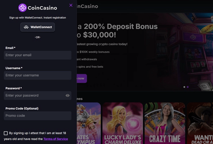 الآن توجه إلى موقع الكازينو اون لاين الذي اخترته. سنستخدم CoinCasino كمثال حيثُ أنه أفضل كازينو بقائمتنا: افتح الموقع وستجد زر “تسجيل” أو “Sign Up”. انقر عليه لتظهر نافذة إنشاء الحساب. عادة سيُطلب منك إدخال البريد الإلكتروني ووضع اسم مستخدم وكلمة مرور. أدخل البيانات المطلوبة. استخدم بريدك الفعلي لضمان التفعيل، قد يطلب منك رمز تفعيل يُرسل إلى البريد الإلكتروني الخاص بك قم بتأكيده.