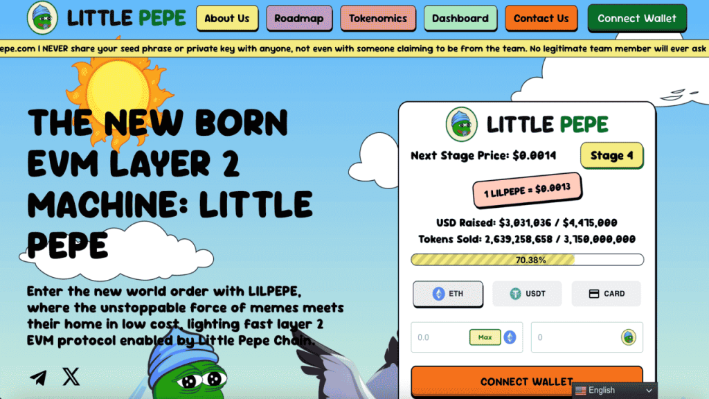 Little Pepe ($LILPEPE)是一個創新的Layer 2區塊鏈,將迷因幣的活力與實質的可擴展性和安全性結合。Little Pepe為速度和超低手續費而打造,其生態系 ERC-20代幣LILPEPE提供動力,驅動整個網路的交易。自預售啟動以來,Little Pepe已籌集了 300 萬美元,反映出投資者早期強勁的動能。