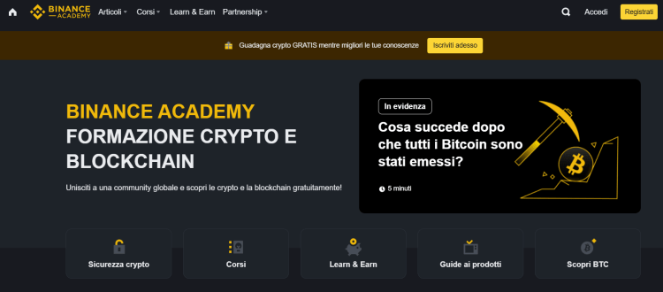La Binance Academy è la piattaforma educativa gratuita di Binance pensata per aiutarti a capire il mondo crypto dalle basi. Puoi immaginarla come una sorta di “università interna” dell’exchange, ricca di lezioni brevi, video, guide e glossari che spiegano tutto: dai concetti fondamentali della blockchain fino alle strategie di trading più avanzate.