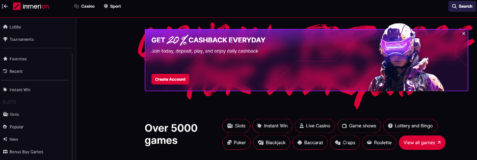 As the best online casino known as one with fast payouts, Inmerion casino offers an extensive and diverse selection of games, including online slot machines, jackpots, table games, live games, instant wins, bonus buys, bingo, lottery, and game shows.