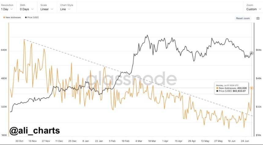 In a recent social media post, crypto analyst Ali Martinez highlights the resurgence of retail investors, as evidenced by a four-month high in new BTC addresses reaching 432,026, adding to the sentiment that investors are betting on a significant price increase for BTC in the coming months, despite recent price volatility.