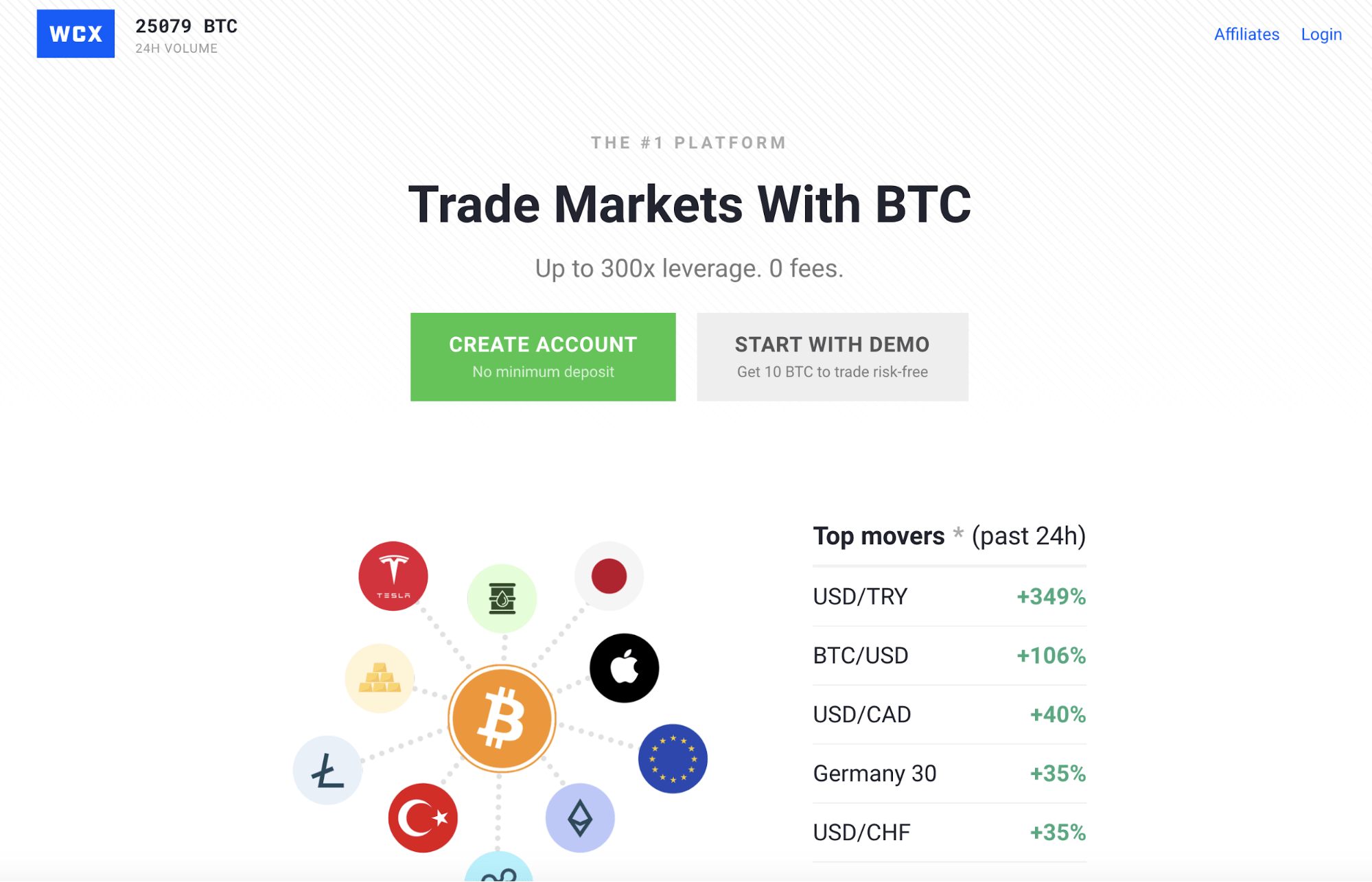 WCX is unique in the trading world as it allows users to trade financial markets using just BTC. It combines the speed and trading experience of a cryptocurrency exchange with the broad range of markets typically offered by traditional brokers.
